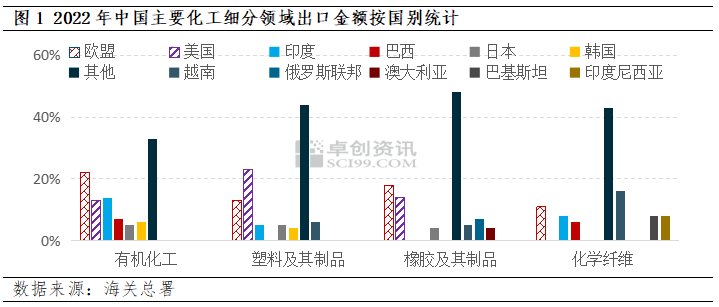 根據(jù)2022年中國主要化工細分領(lǐng)域出口金額的數(shù)據(jù)來看,2022年我國出口至歐盟的有機化工品金額占比達到了20%以上。