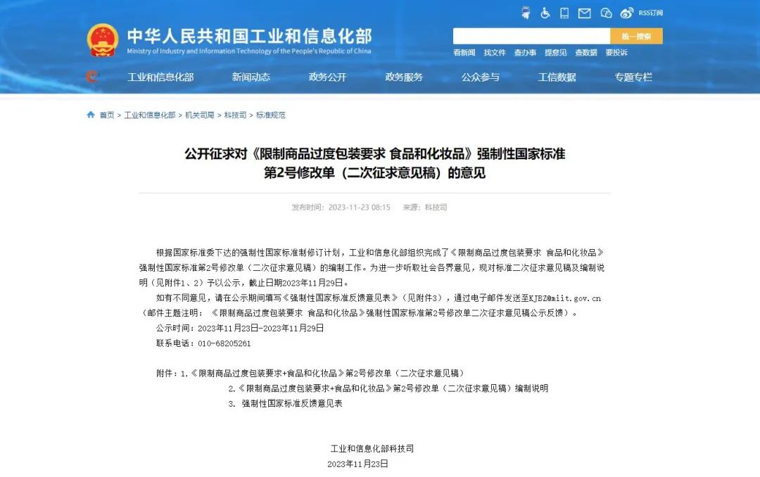 11月23日,工業(yè)和信息化部官網(wǎng)發(fā)布消息:根據(jù)國(guó)家標(biāo)準(zhǔn)委下達(dá)的強(qiáng)制性國(guó)家標(biāo)準(zhǔn)制修訂計(jì)劃,工業(yè)和信息化部組織完成了《限制商品過(guò)度包裝要求 食品和化妝品》強(qiáng)制性國(guó)家標(biāo)準(zhǔn)第2號(hào)修改單(二次征求意見(jiàn)稿)的編制工作,并對(duì)標(biāo)準(zhǔn)二次征求意見(jiàn)稿及編制說(shuō)明進(jìn)行了公示,截止日期為2023年11月29日。