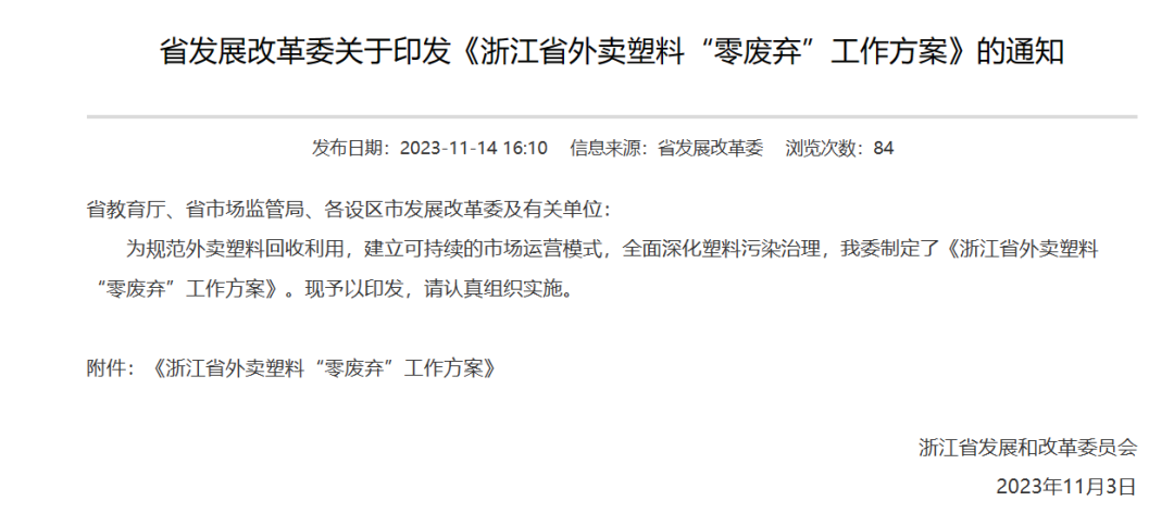 為規(guī)范外賣塑料回收利用,全面深化塑料污染治理,近日,浙江省發(fā)展和改革委員會(huì)制定了《浙江省外賣塑料“零廢棄”工作方案》。